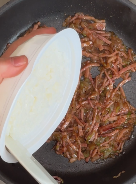 즉석밥을 렌지에 돌리지말고 꼭 그대로 넣어주세요그래야 질어지지 않게 맛있는 볶음밥을 만들 수 있습니다. 😀